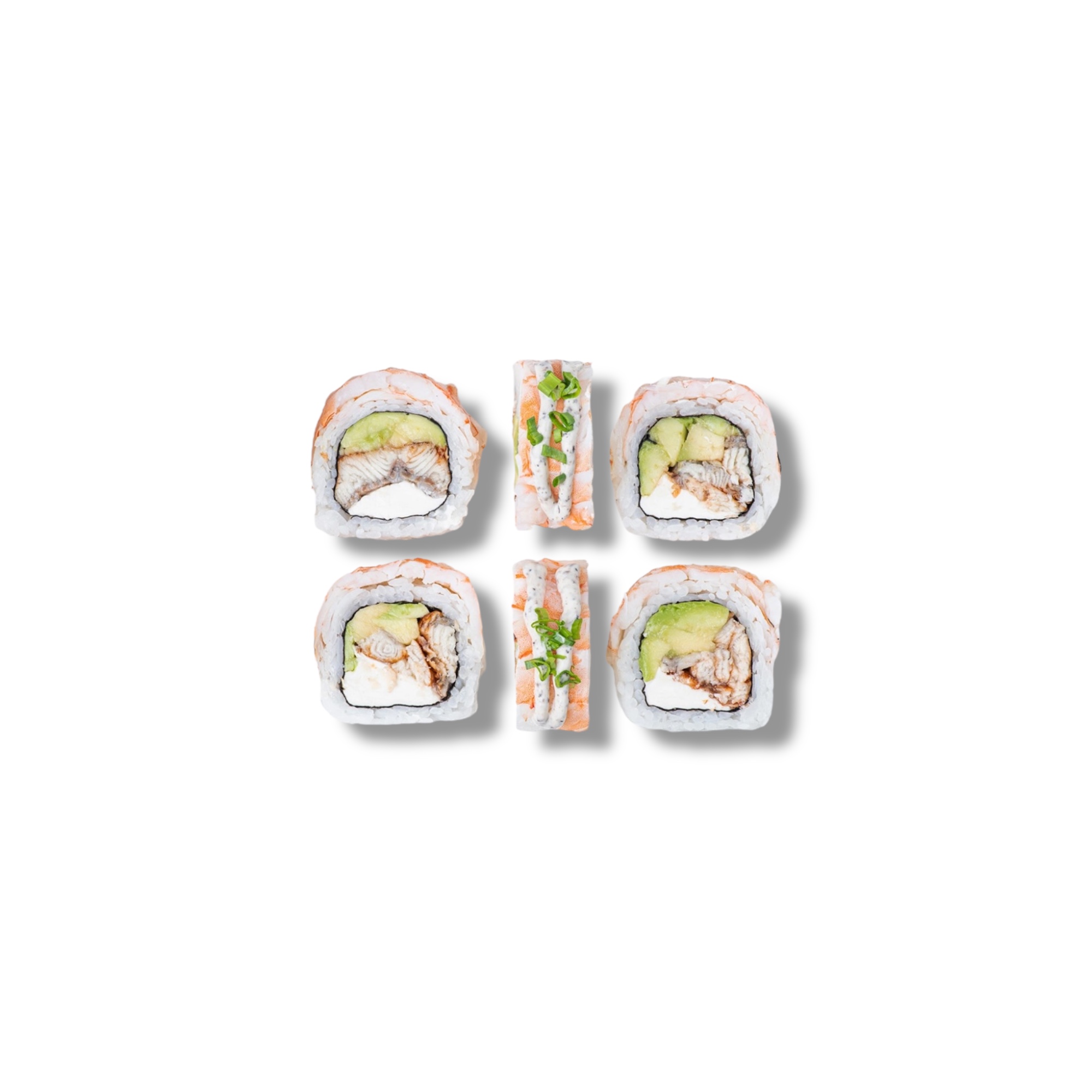 Креветка, сливочный сыр, угорь, авокадо, лук зелёный, рис, нори