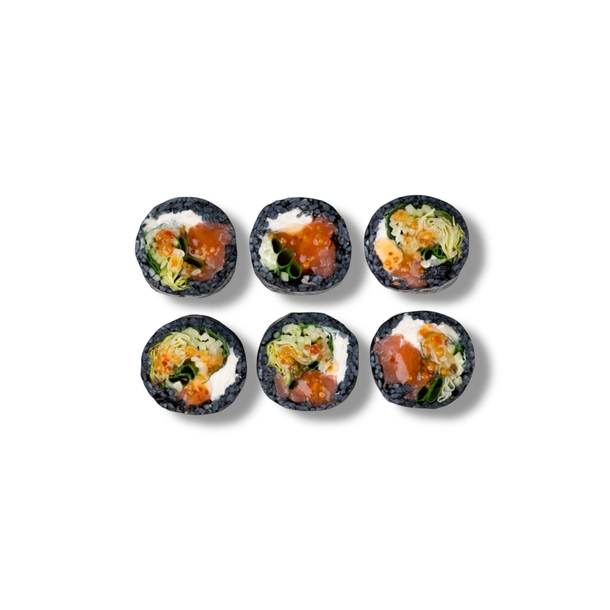 Лосось, сливочный сыр, огурец, салат айсберг, зелёный лук, соус сладкий чили, чернила каракатицы,