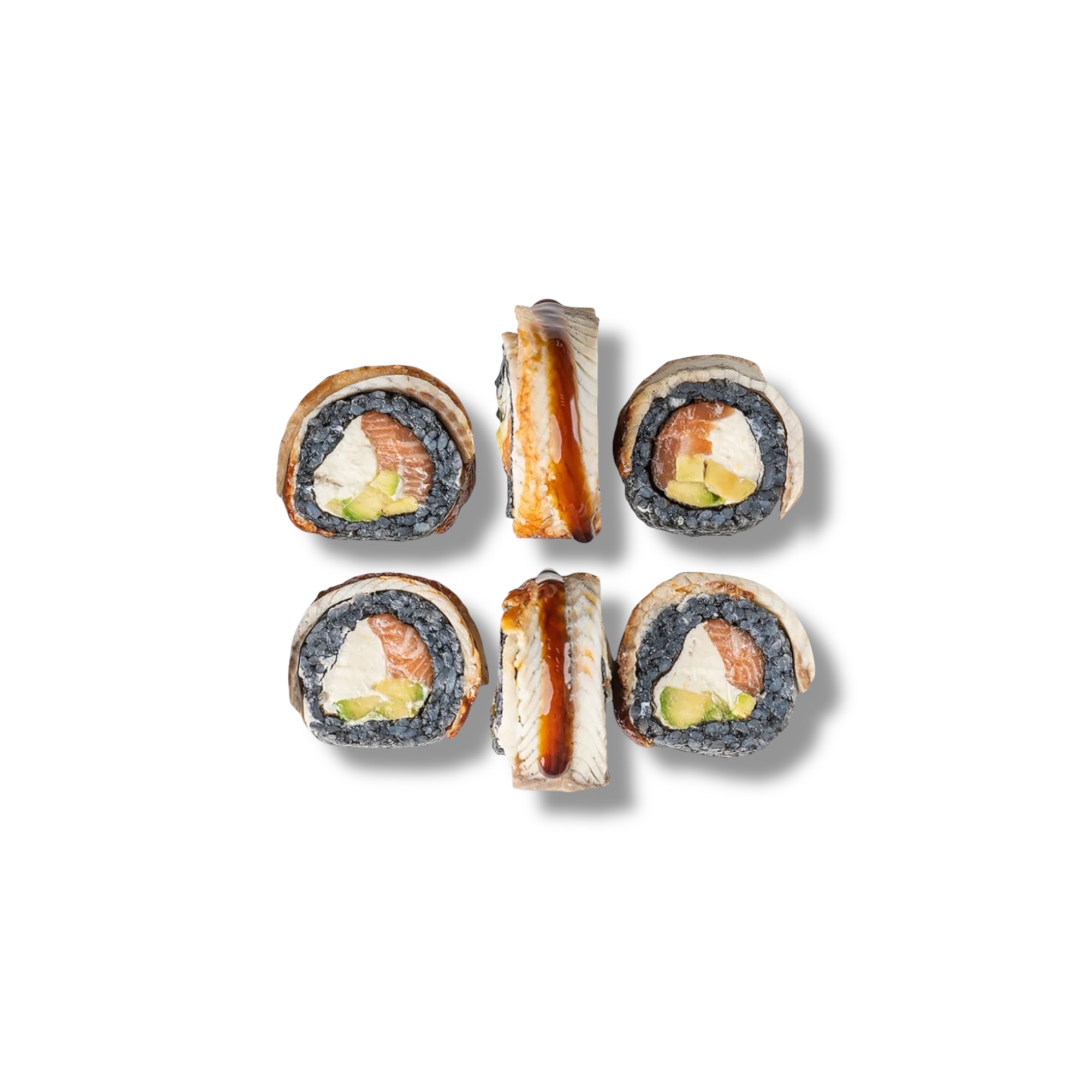Угорь, лосось, авокадо хасс, сливочный сыр, унаги соус, чернила каракатицы, кунжут, рис, нори