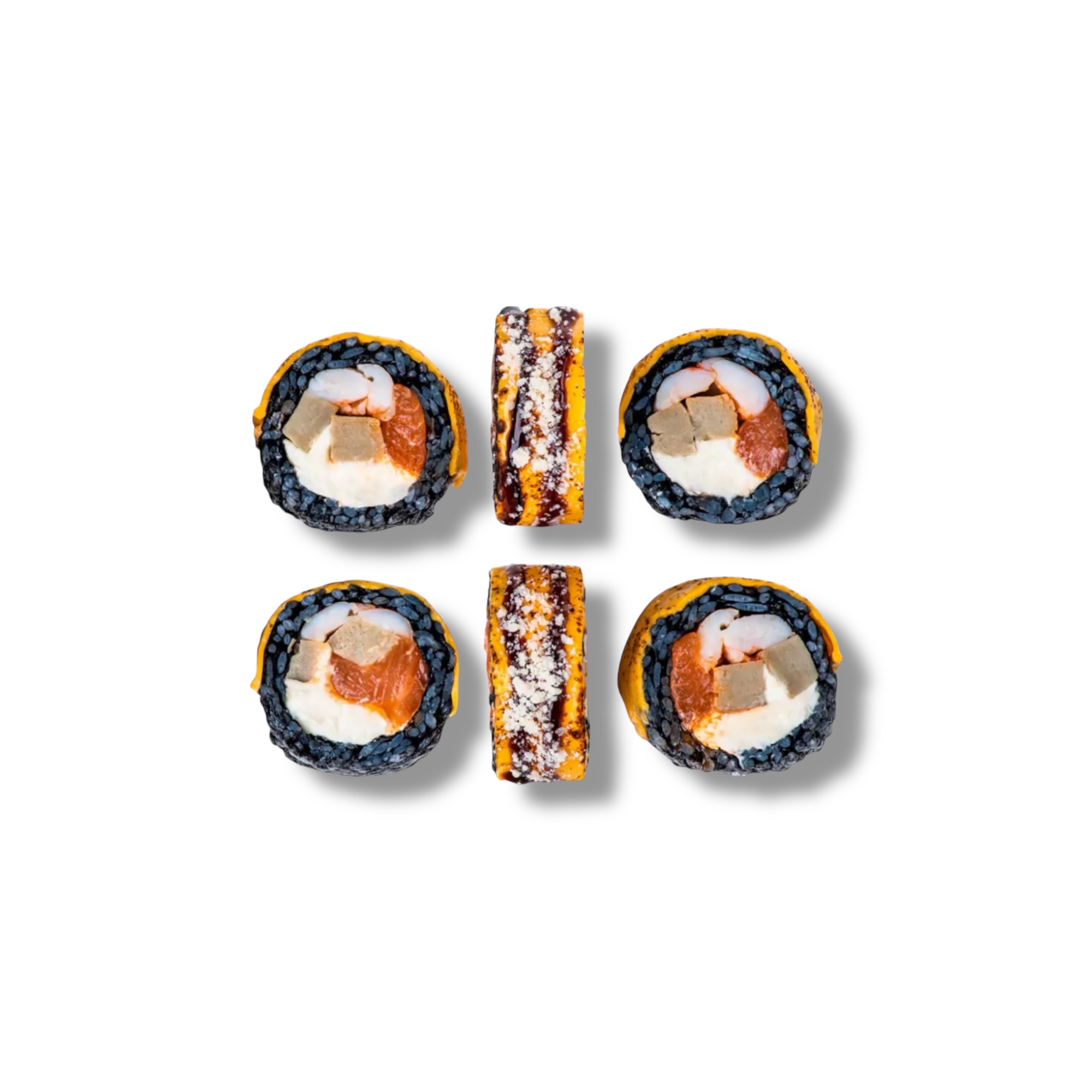 Лосось, креветки, сливочный сыр, опаленный чеддер, сыр пармезан, унаги соус, чернила каракатицы, рис, нори