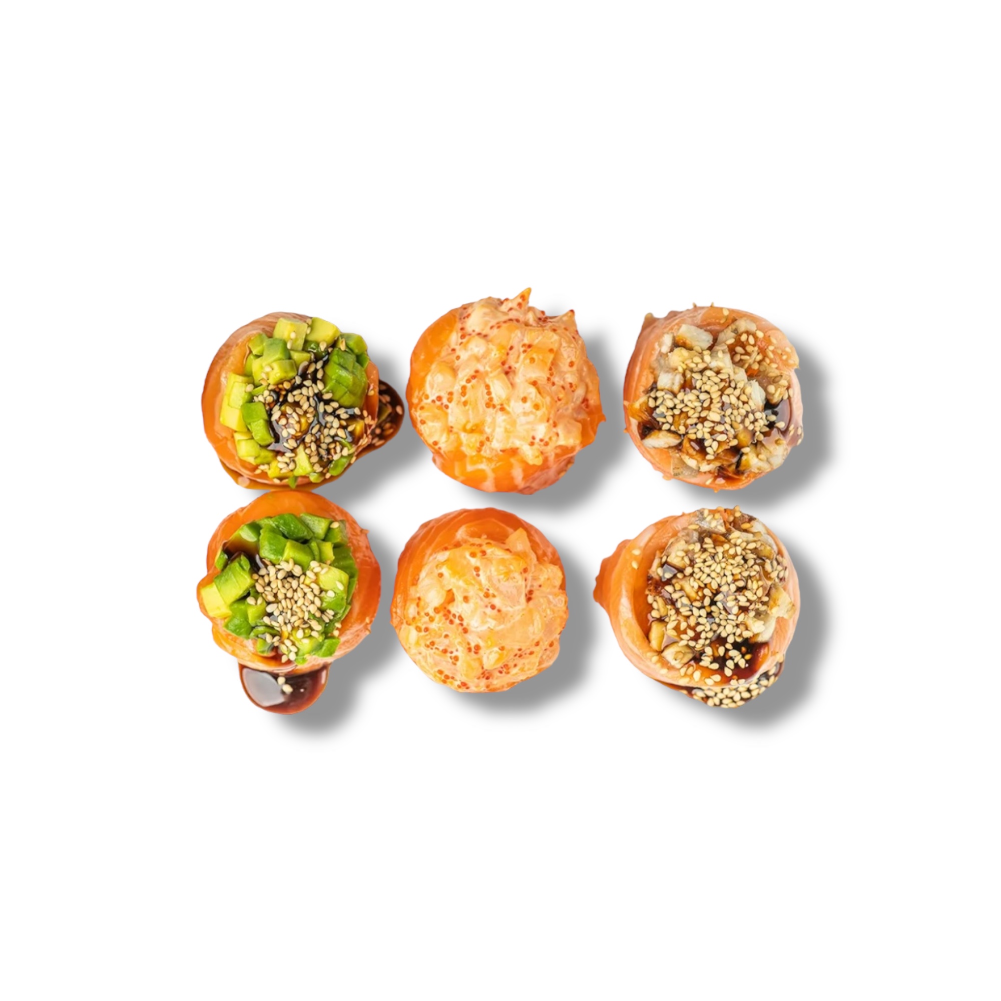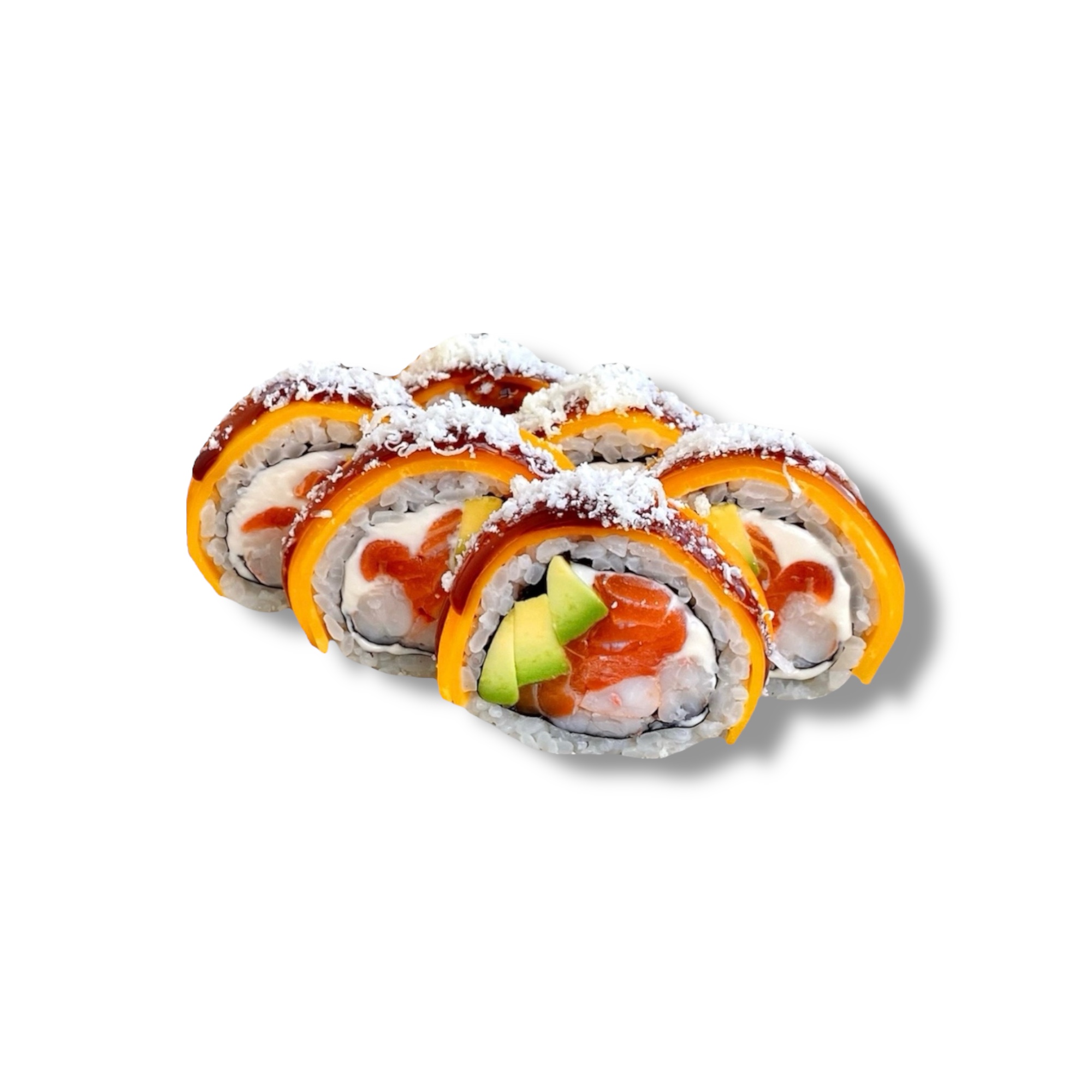 Лосось, креветка, авокадо, угорь, спайси соус, унаги соус, кунжут, икра масаго, рис