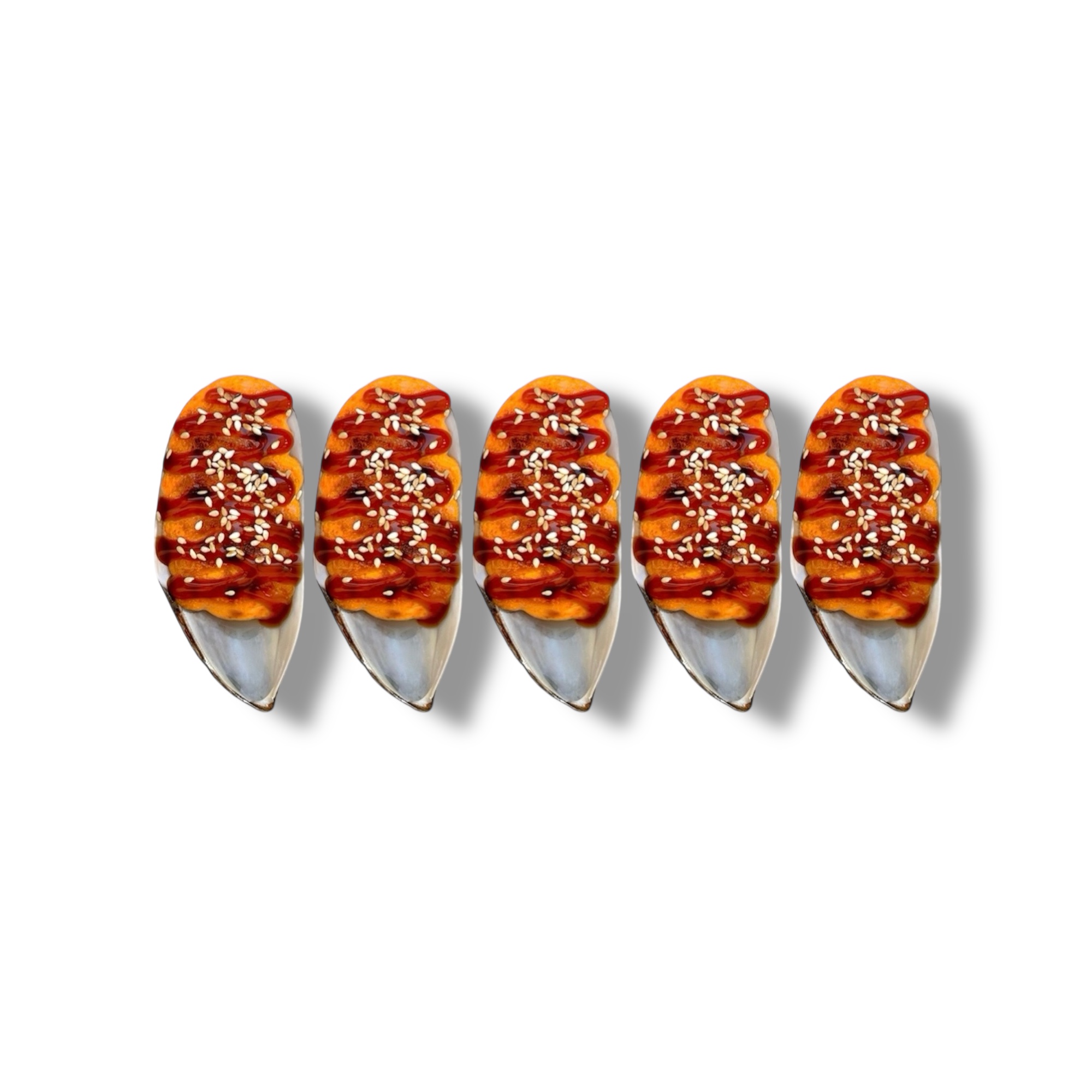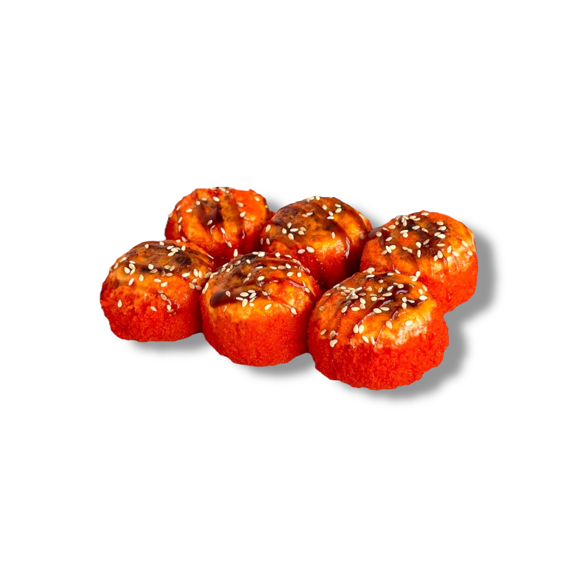 Политые соусом унаги и посыпаны ароматным кунжутом. Подаётся с лаймом.