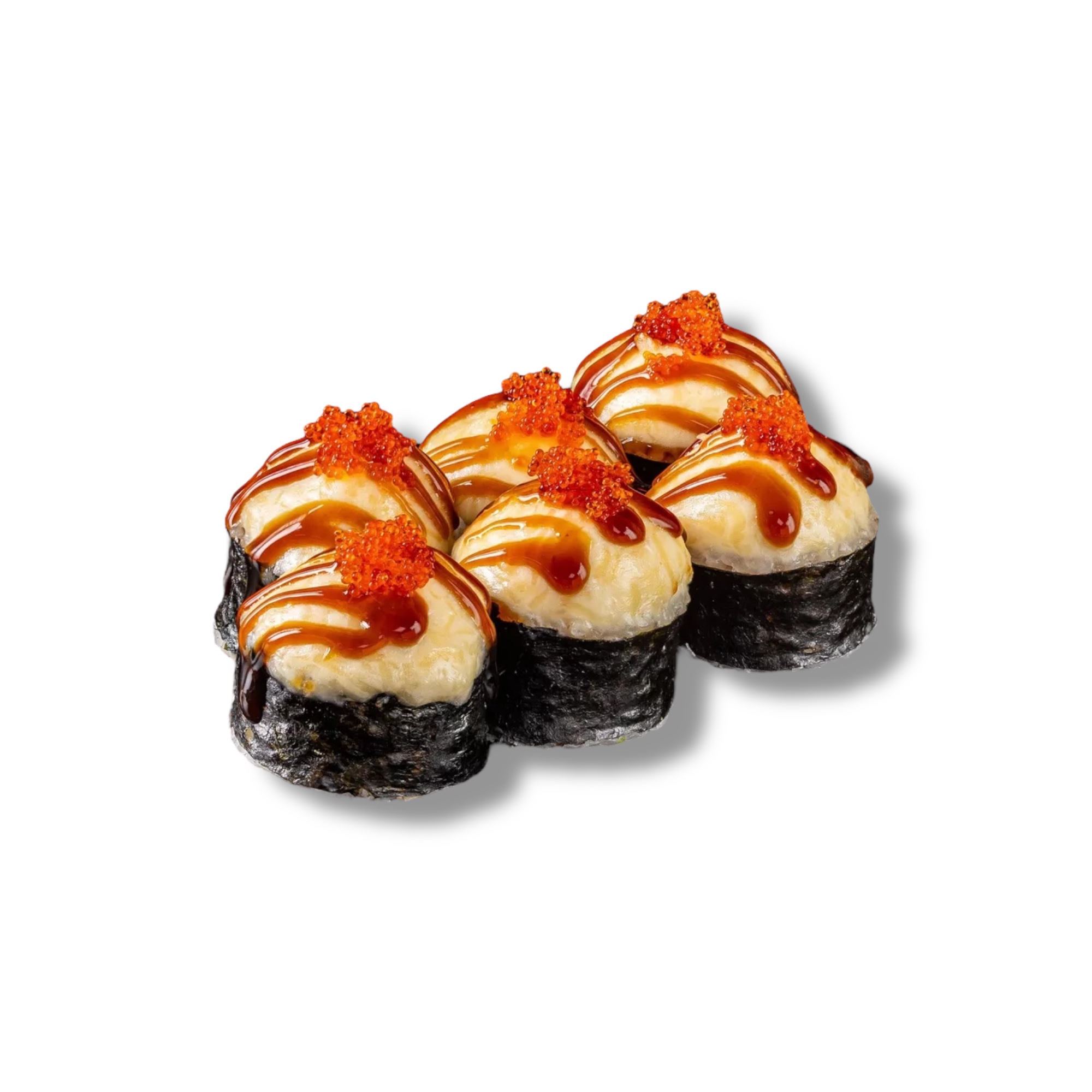 Креветка, икра масаго, сливочный сыр, огурец, нежная запечённая шапочка, унаги соус, рис, нори