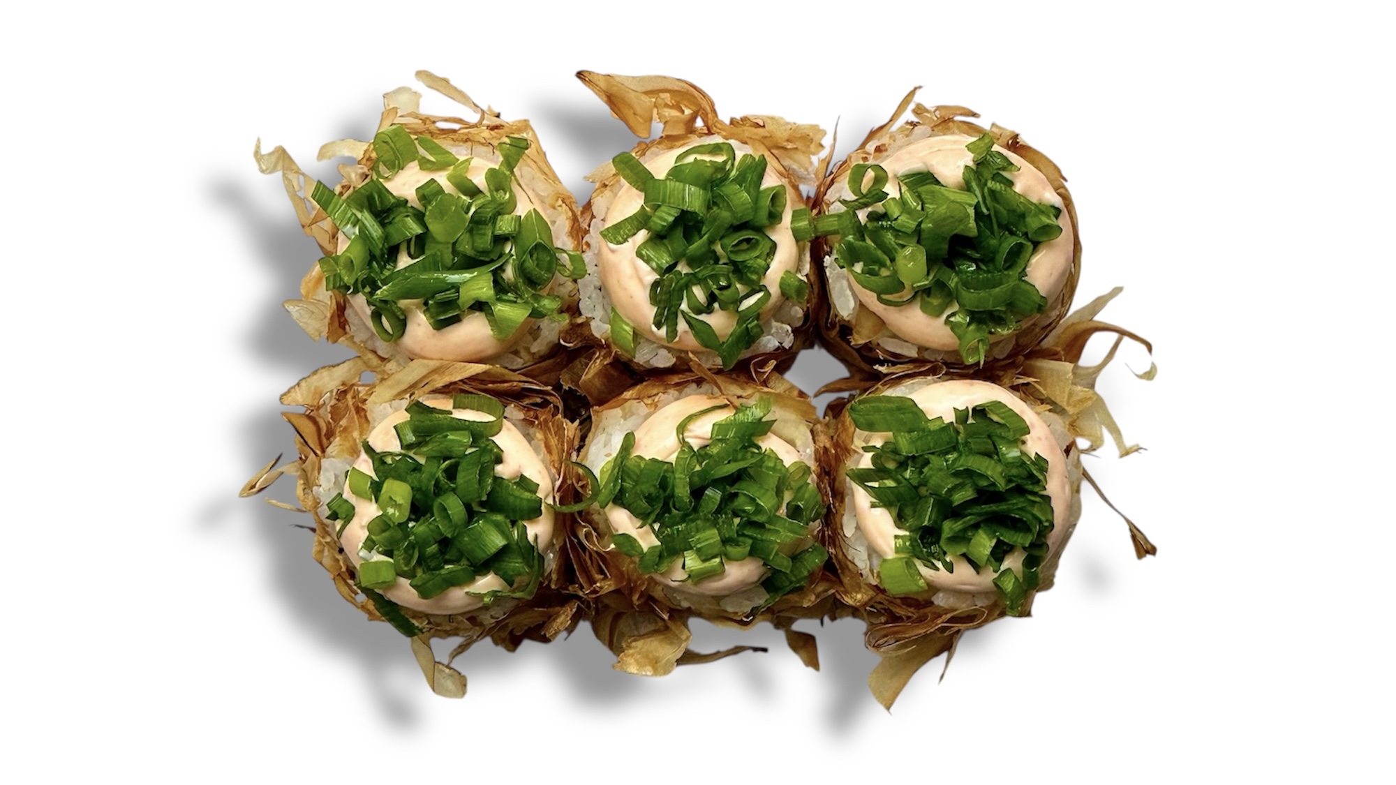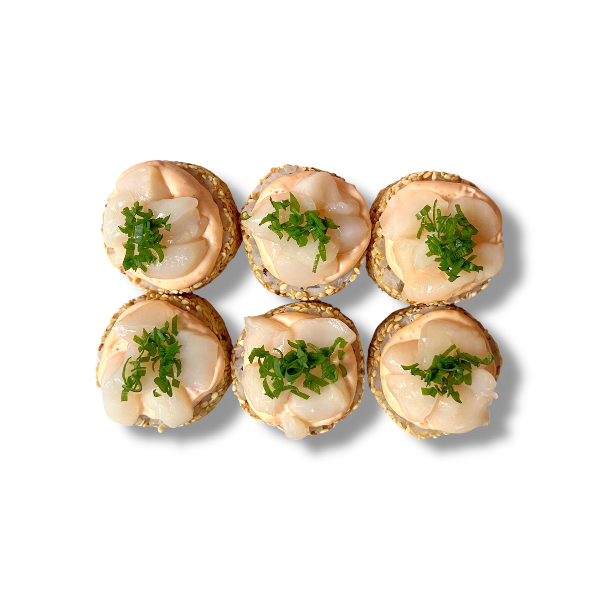 Гребешок, спайси соус, сливочный сыр, огурец, салат айсберг, зелёный лук, рис, нори