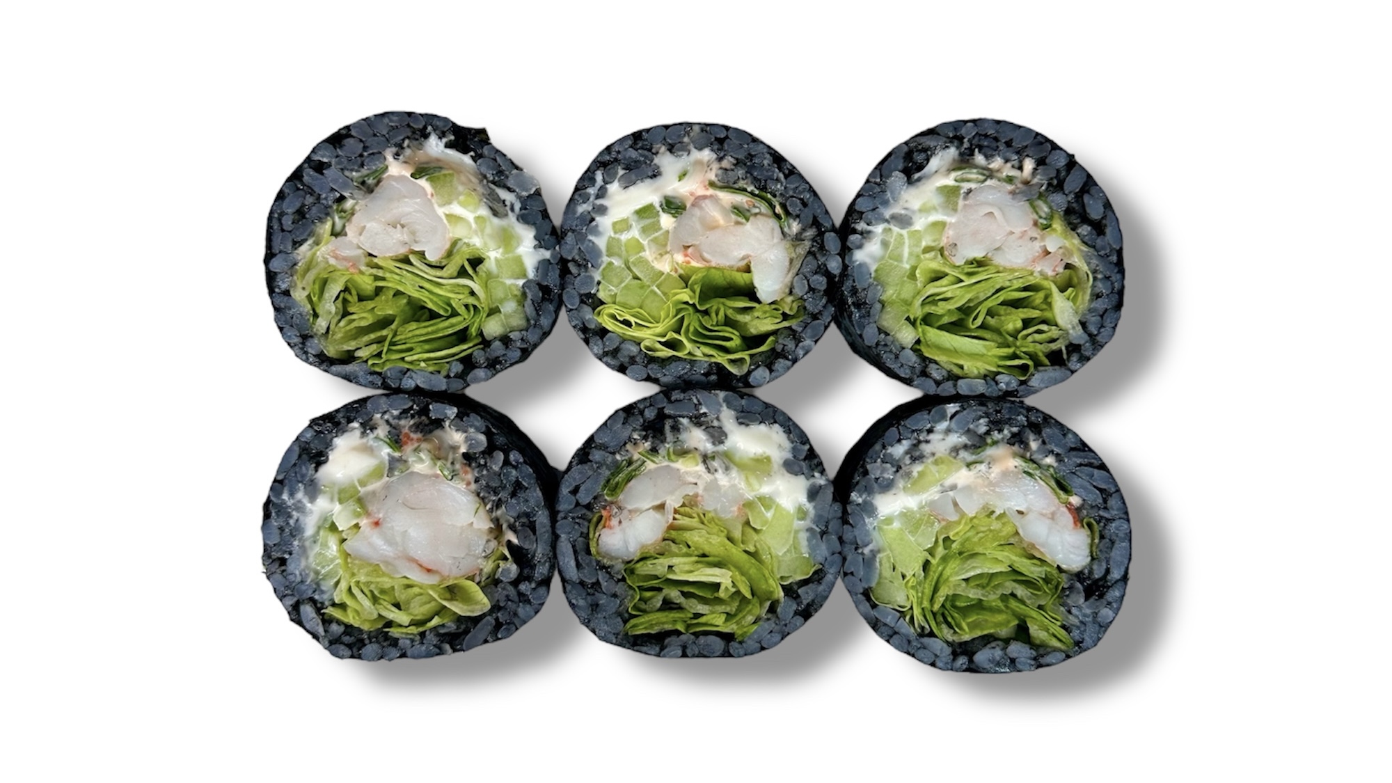 Креветка, плавленый сыр, огурец, салат айсберг, зелёный лук, спайси соус, чернила каракатицы,