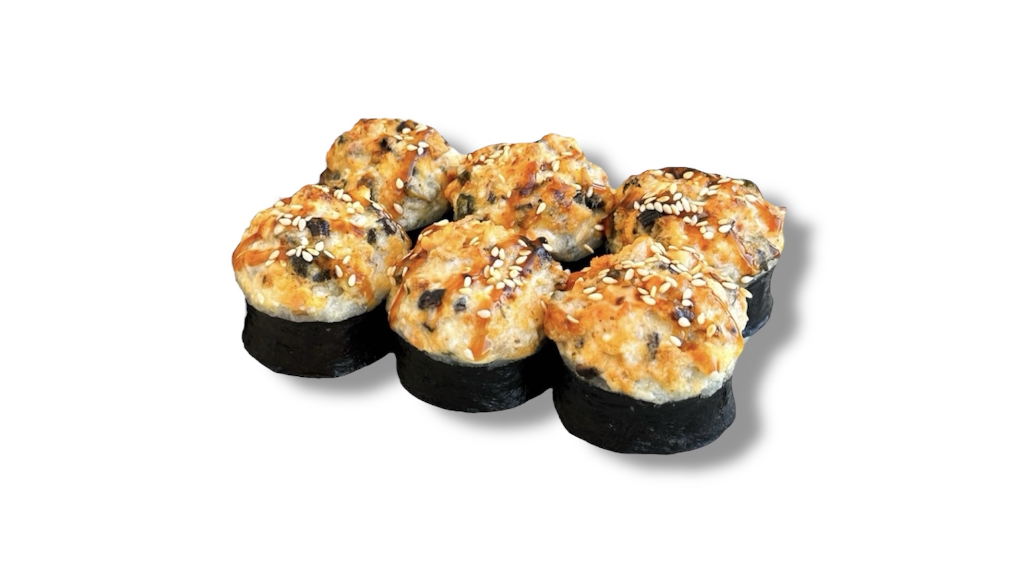 Мидии запечённые в нежной шапочке, сыр моцарелла, спайси снежный краб, соус унаги, кунжут, рис, нори